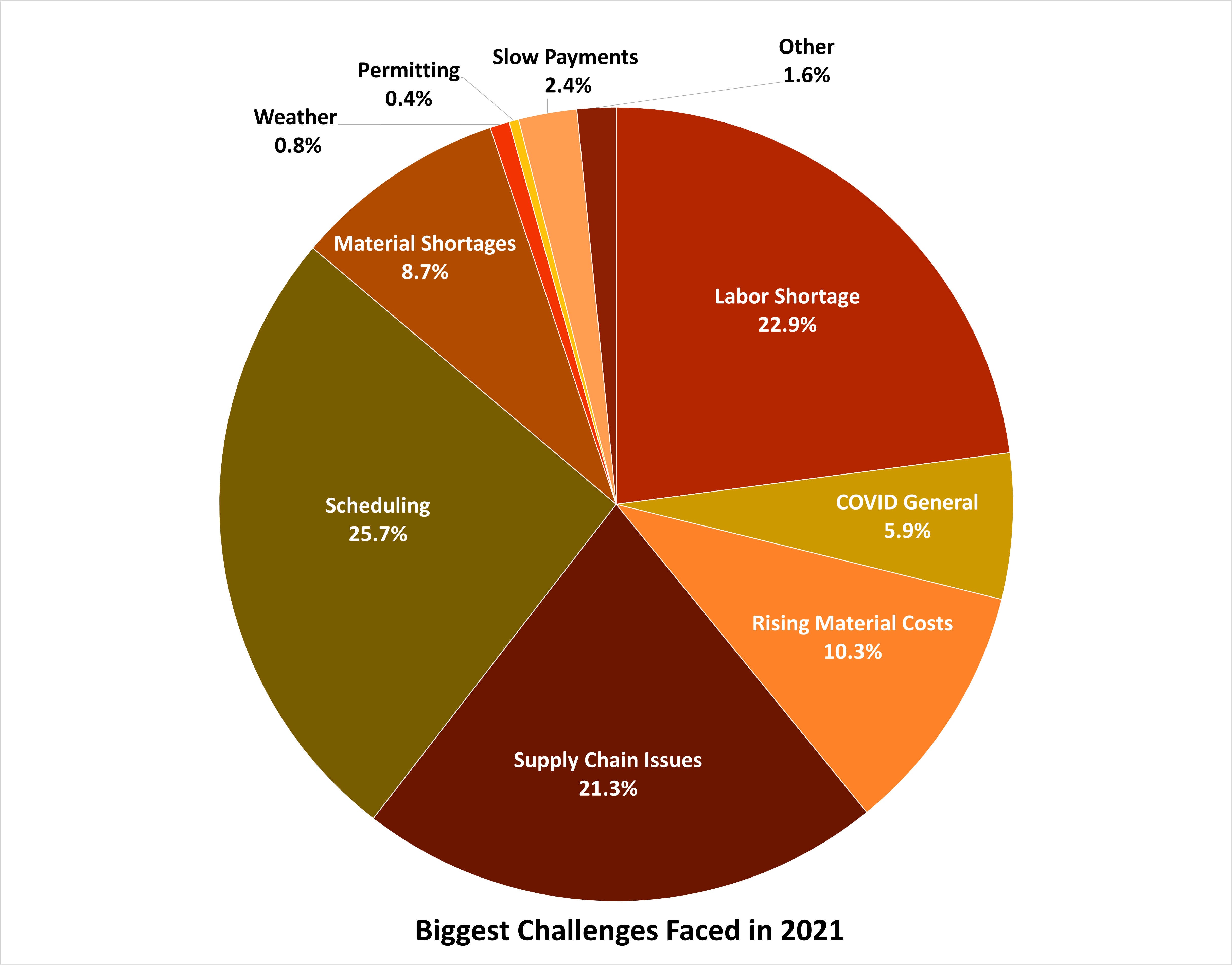 Last year, when we asked what the biggest challenges they faced in 2020 were, they reported general COVID issues (30.1%) and COVID work requirements (10.3%) were the most significant. The availability of labor continued to be a pressing issue that year with about a quarter of respondents saying it was hard to find skilled labor.