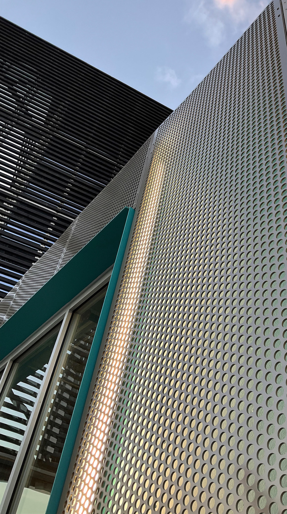 Exterior linear LED lights are located at the supports for the perforated metal panels. “Wherever we have a perforated metal seam,” Pierson explains, “we have a very thin light that is concealed, and it backlights the cavity so the perforation holes glow at night.”
