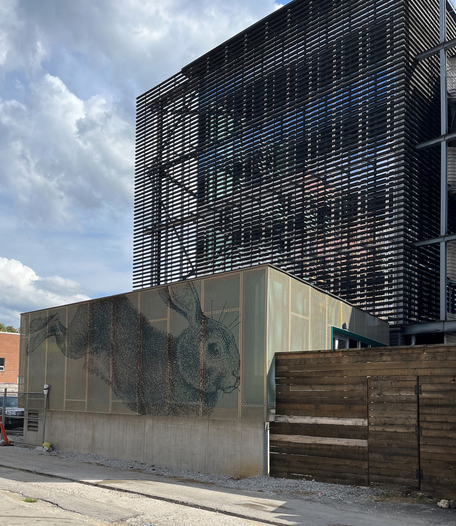 Additionally, the side of the building facing the alley has a painted “rabbit jumping down a hole” logo on it. The use of metal echoes the extensive use on the main Rabbit Hole Distillery, and the perforations, when lit from behind, reinforce the landmark status of the building’s historic downtown location.