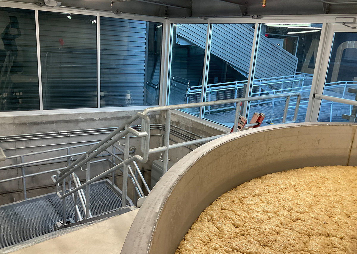 To complement the transparency of the original structure, the tank expansion building is wrapped with a perforated metal screen. According to Pierson, Zamanian asked them to consider transparency as the main theme of the design. “When you’re going toward Rabbit Hole, you see all the functions of the distillery, the entire process from grain delivery to barreling and bottling,” Pierson says. “We think it’s unique, the way it shows it. And everything is shown in the sequence of making. So, we wanted to do the same thing with the kiosk. We have very large windows, so as people from Market Street come in and pass through, they can see inside; kind of a precursor to what they’re going to get on the overall tour with the fermentation tanks.”