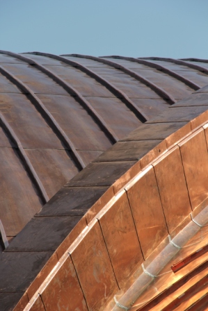 Now installed, the original light bronze color of the copper is slowly beginning to turn dark brown due to exposure to the elements. Over the next 20 years or so, the roof will patina to a soft green.