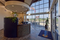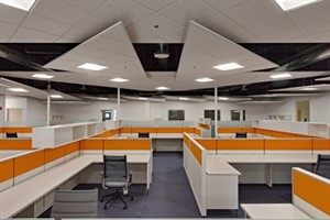 While the outside of the building serves as a strong branding statement for Hamstra, the inside is all about business. Not only does Hamstra conduct its regular business, but it also does extensive employee training. The main office area inside is defined by an open-grid ceiling system that intersects and overlaps itself in a complicated pattern. “There are 40 people in the office,” says Dingle. “Hamstra wanted to absorb a lot of sounds so the ceiling isn’t a flat volume. They also wanted to expose their ductwork so when a client comes in, he can see the guts of the office and how the distribution system works.”