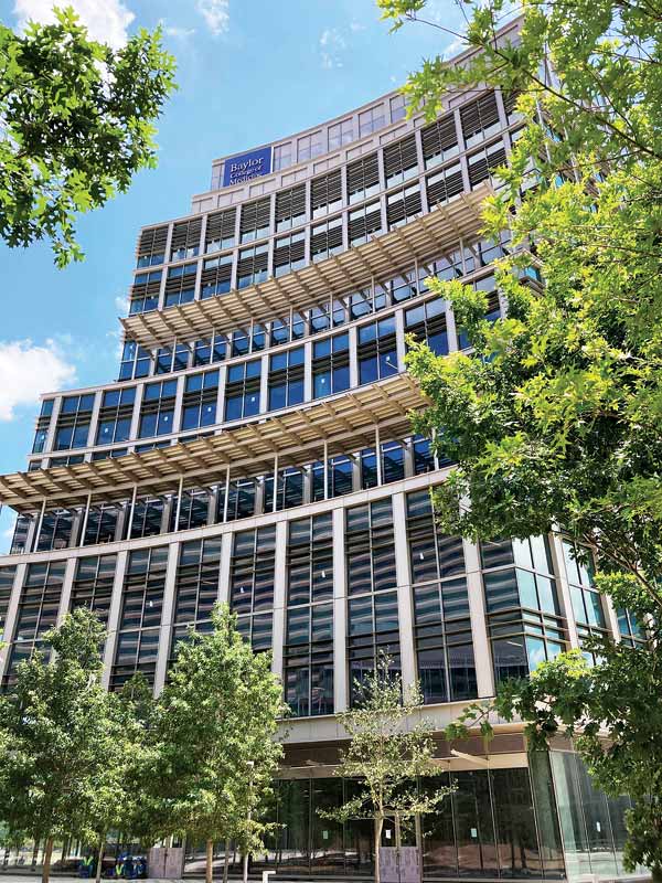 The first technique achieves long projections with a completely aluminum system. An example is the trellis system at Baylor College of Medicine in Houston, Texas. Essentially, the facility features a custom aluminum trellis system comprised of 406 mm (16 in.) oversized arched blade infill attaching to cantilevered support tees. Baylor achieves up to 6.4 m (21 ft) projections with the support of horizontal aluminum tubes supported by 0.2 mm (8 in. ) diameter aluminum vertical tubes. Added strength was achieved with tubes spanning support tees, creating more stabilization and spanability. Precision field dimensioning was required to follow the contour of the structure of this multi-leveled façade of outdoor spaces. The final product boasts a low-maintenance, durable, fully engineered, and assembled system.
