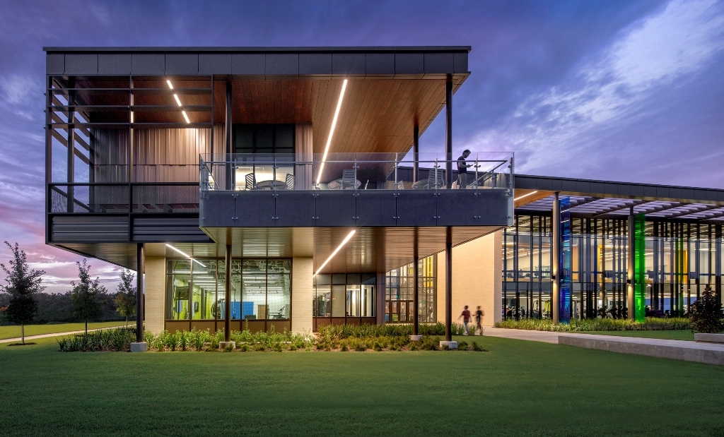 The building’s form is inspired by and reflects its active functions. Dramatic overhangs, anatomical curves and rhythmic articulation of the façade evoke a sense of shifting and dynamic motion. Wellness is emphasized with its curtainwall, introducing natural light and opening vistas to the woodland campus. The curtainwall was manufactured by Monett, Mo.-based EFCO Corp., and both Flower Mound, Texas –based Texas Fenestration Inc. and Dallas-based Haley-Greer Inc. provided fabrication and installation for it.
