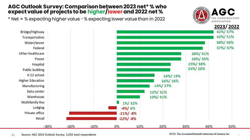 More than 1/3 of respondents to Associated General Contractors of America’s U.S. Construction Outlook survey anticipate federal construction projects to grow in 2023. [Figure 1] (Image courtesy of AGC)