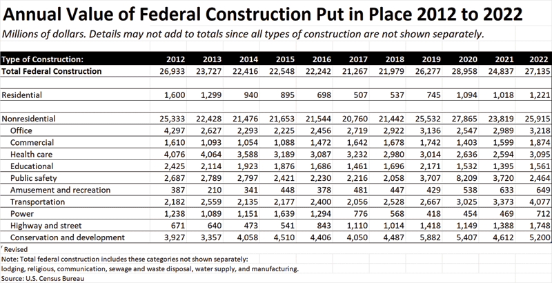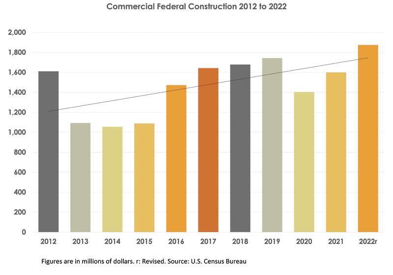 Spending on federal government commercial construction was $1.8 billion in 2022, a 16.4% rise since 2012 when it was $1.6 billion. [Figure 4]