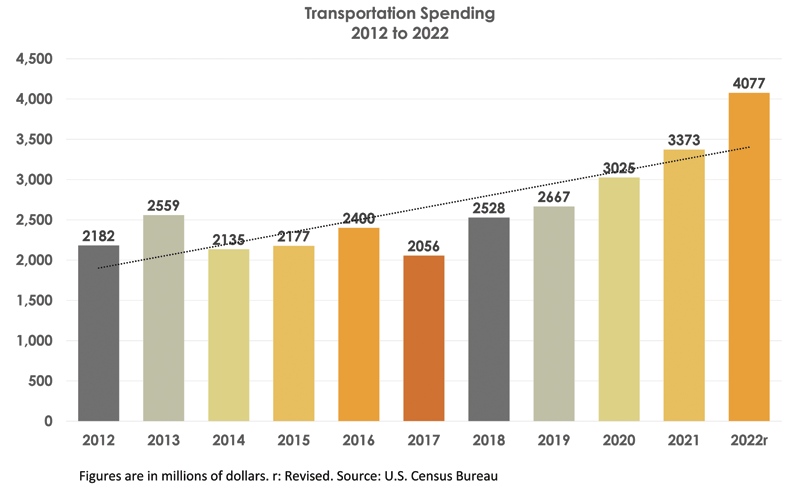 From 2012 ($2.2 billion) to 2022 ($4.1 billion), annual spending in transportation construction for the federal government expanded 86.8%. [Figure 3]