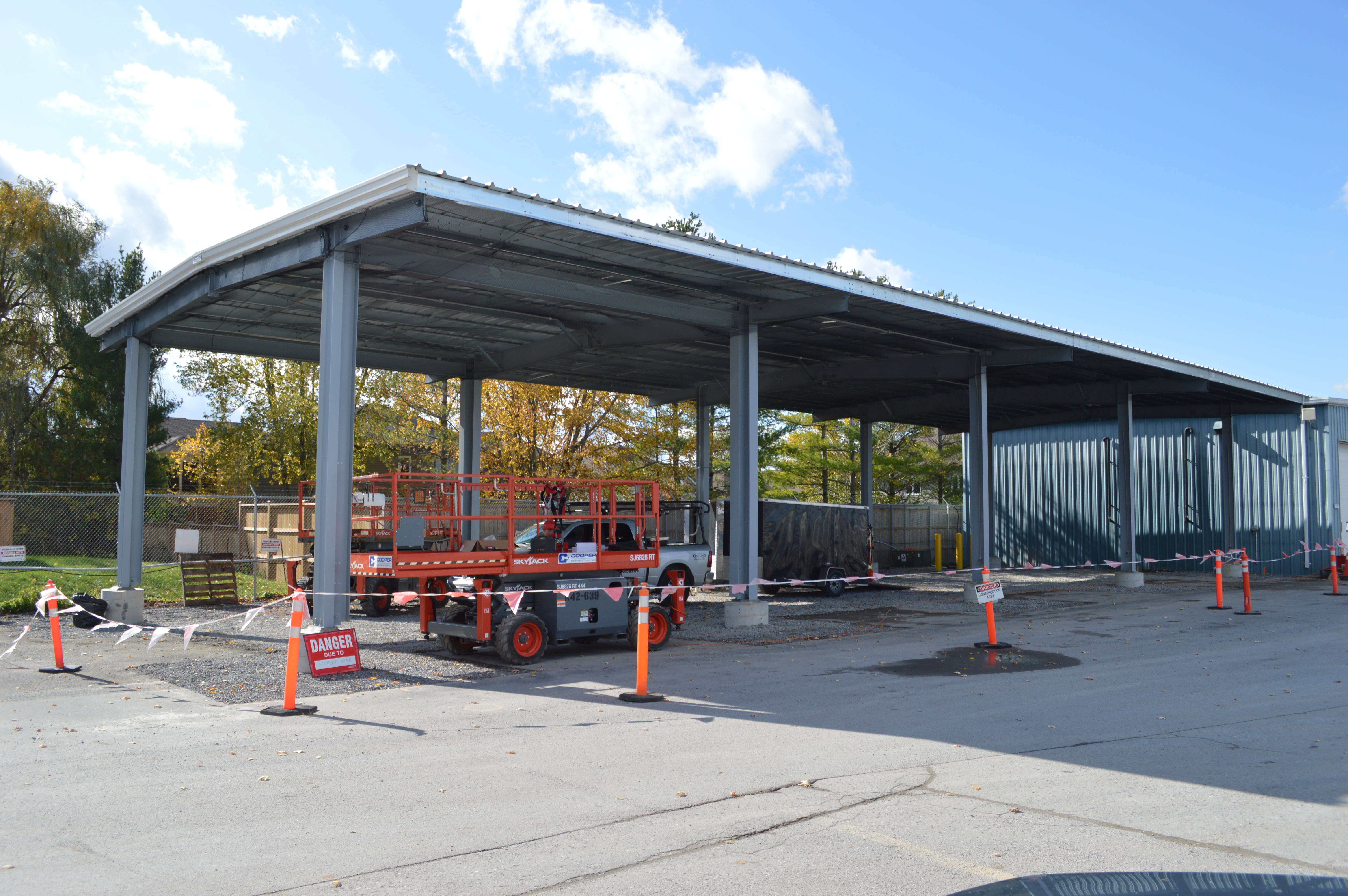 To build this truck shelter in an active utility company yard, this site was separated with barriers to define the limits of the construction site from the active yard. (Photo courtesy of Bel-Con Design-Builders Ltd.)