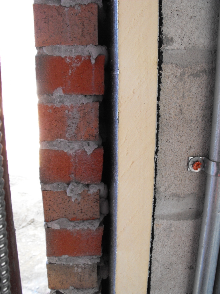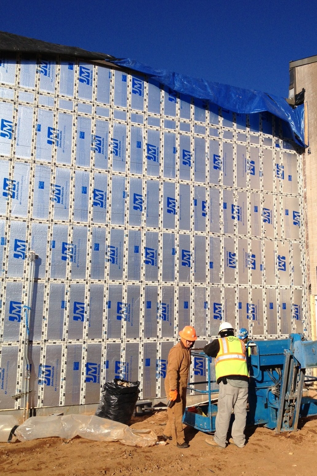 Johns Manville AP Foil-Faced Polyiso Foam Sheathing was used in this renovation project on the steel-framed exterior wall as a weather resistive and air barrier to prevent water and air leakage behind a brick cladding of a local school. AP Foil, combined with flashing tape, is an effective solution for preventing air and water leaks in walls, as well as preventing thermal bridging in steel-framed walls. (Photo courtesy of Johns Manville)