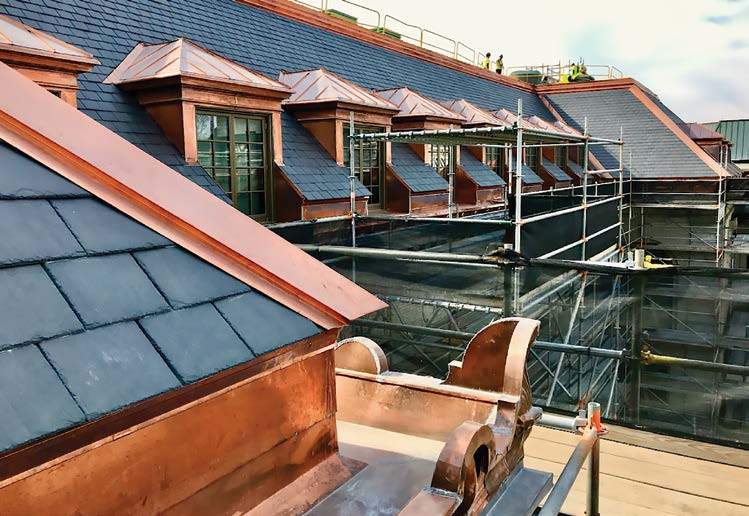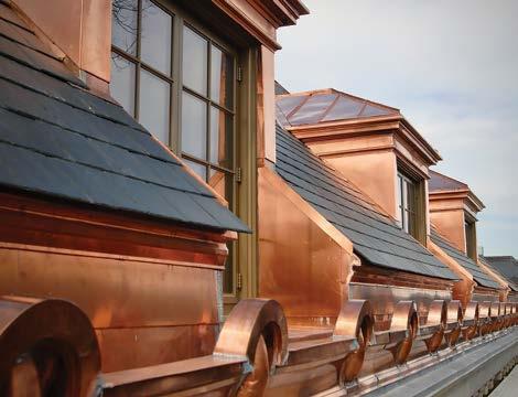 To complete the roofing retrofit, Revere Copper Products Inc., Rome, N.Y., supplied 25 tons of 20-ounce copper. Wagner also used 50% tin/50% lead solder, and North Country Unfading Black Slate.