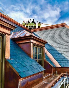 Jagusch says the slate installation was also quite unique, given the age of the concrete deck. “In order to properly hang the slate on each individual copper nail, a series of pressure treated 2-by-4 sleepers were first installed into the ice and water shield-adhered concrete deck with threaded anchors set in epoxy. By doing so, the sleepers provided an adequate nailing base for the slate installation, again promoting the longevity of the system as a whole.”
