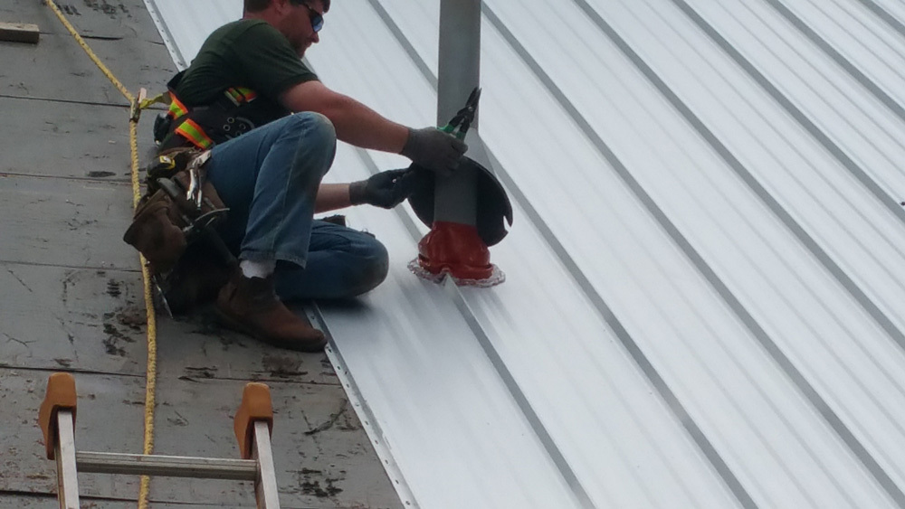 Installing an EPDM heat-resistant pipe boot on a standing seam metal roof. (Photo courtesy of Caldwell Contracting)