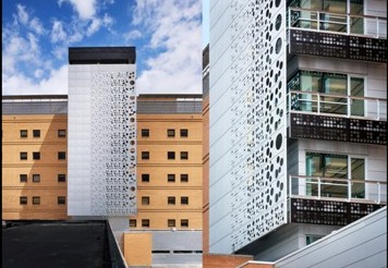 IKM architects were drawn to a metal panel solution for its contemporary, forward-looking expression,⎯something the hospital was also seeking by way of rebutting the competition. Design options included perforated openings in the metal panels. One option offered a unique, but somewhat permanent, branding opportunity to include images created on the panels by the design of the openings. The second option offered more a random or specified pattern, no images. The hospital chose to move forward with the second solution.