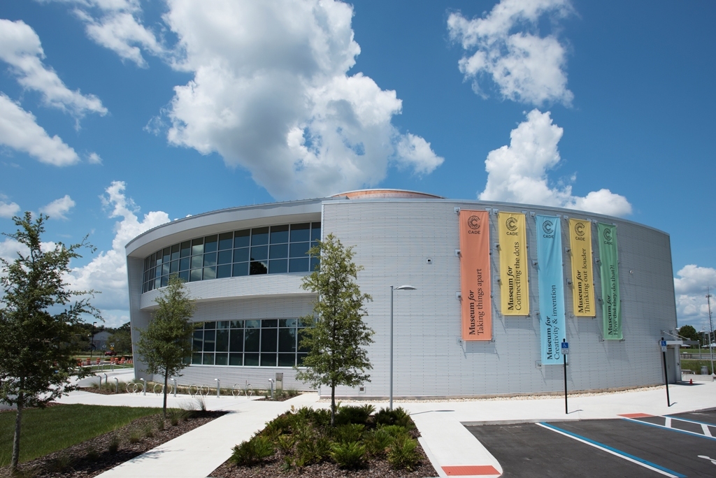 The museum functions as an attraction in Depot Park’s northwest corner. It is bound by a major roadway to the west, stormwater retention ponds to the east, and a parking lot to the south. Further connecting the museum and park, there are walking paths, bike trails and a series of bollard-like donor statues spiraling from one of the museum’s dual entrances into the park.