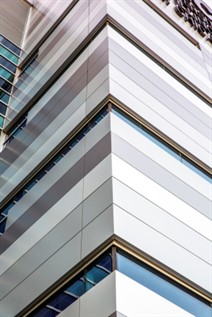 On its exterior façade, more than 42,000 square feet of 4-mm Reynobond ACM with a fire-resistant (FR) core, finished in three Colorweld 500 colors, were fabricated and installed in a random pattern. “We were interested in a somewhat subtle variation in the tone of grey for the exterior of the building,” says Roderic Walton, project manager for Moody Nolan. “It created a more active façade, something that would attract interest from the passerby. Once we had the base (standard) color, we were able to work with