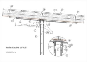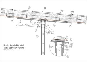 In the case of the fire barrier parallel and offset from the purlin (Figure 2), the purlin may not be utilized to provide the required support to compress the mineral wool insulation. Instead of the purlin, a min.