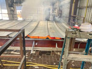 This new joint system was tested at Intertek Testing Services NA, Inc. in accordance with the ASTM E2837 standard. The tested one-hour fire-resistance-rated wall assembly was positioned during the test perpendicular to the roof purlins (worst-case orientation) and fully insulated roof cavity, as shown in Figure 3. The results of this testing showed the unrated roof assembly would fail first and provide venting of flames or hot gasses from the building before any failure of the wall or its continuity joint system (Figures 4 and 5). In other words, the unrated roof was demonstrated to be the proverbial “weakest link” of this intersection, as expected, thus satisfying the ASTM E2837 acceptance criteria. As previously stated, 2021 IBC Section 707.9 does not require the continuity joint system to be tested or have an hourly rating. Thus, compliance with the intent of this section of the code can be demonstrated via the “Alternative materials, design and methods of construction and equipment” code provisions found in IBC Section 104.11 based on this test.