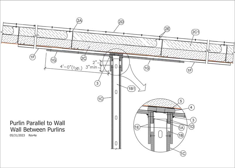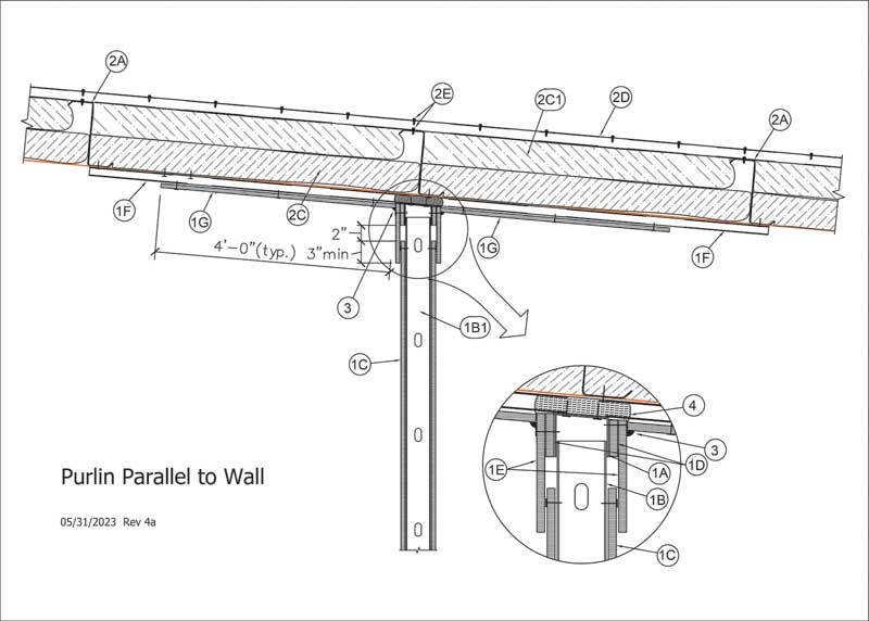 | 1A – Min. 16 ga steel U-shaped deflection channel | 2B – Purlin lateral bracing (not shown) |