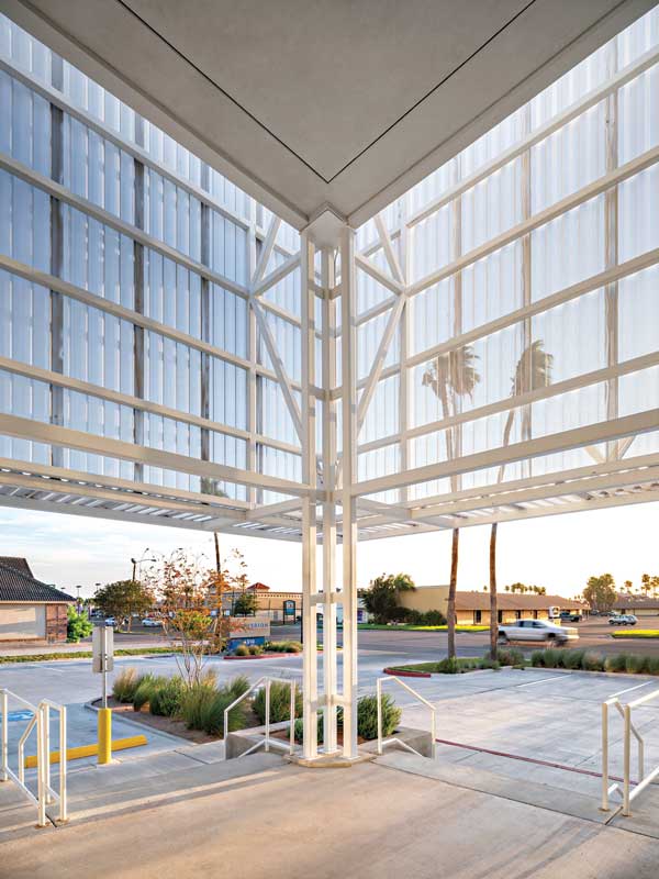 “The vertical veil creates an interstitial space between the shading veil and the actual outside wall of the building” he adds. “I love the way that space feels as you walk under it going up to the front door. When you’re walking along the outside wall, you can look up and see the space between the shading veil and the outside wall. That’s something you really don’t experience often, or ever, on big-box retail buildings.”