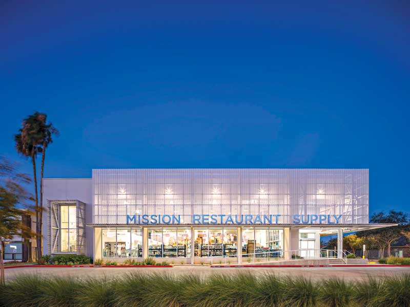 At night, Mission Restaurant Supply gives off a “striking jewel box effect.”