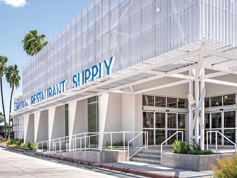 Sunlight hits the covered entrance to Mission Restaurant Supply