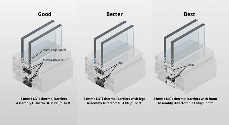 Improving the performance of aluminum-framed fenestration typically starts with reducing the conductive heat flow by making a “thermal break” in the continuous metal using a non-metallic material. These non-metal components are called thermal barriers. The wider the separation between the frame’s outer and inner surface that the thermal barriers provide, the lower the thermal conduction is in the fenestration system. Specifying a thermal barrier size of at least 25 mm (1 in.) is recommended, as this typically improves the condensation resistance as well as the fenestration U-factor.