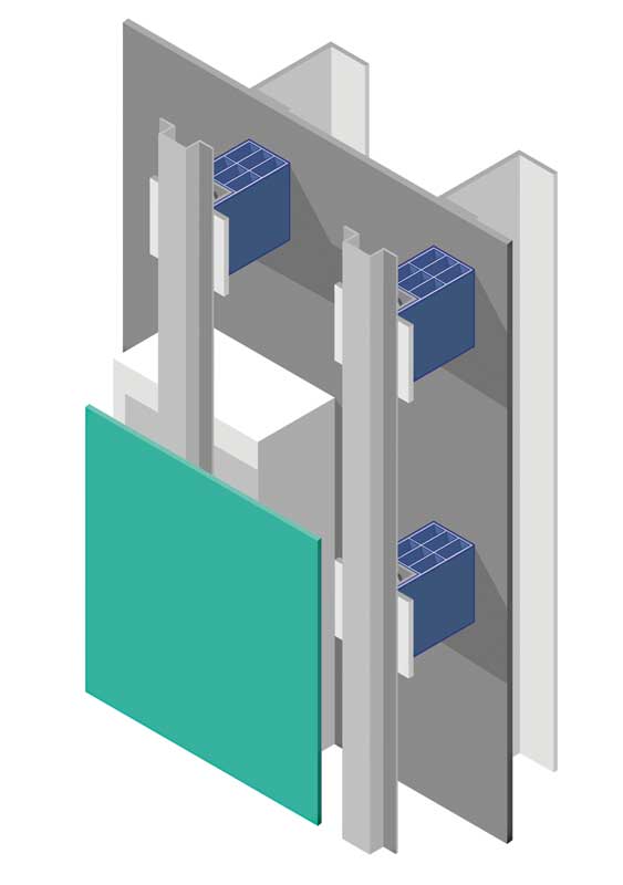 - At the connections of opaque panels to the building structure—typically, continuous metal Z-girts are used to connect high thermally performing opaque panels to the building. This can reduce R-values by more than 50 percent, which is often not considered in building energy modeling. This is a concern when considering window-to-wall ratio, and walls are always considered to have higher insulation performance. Depending on the wall construction and attachment, it may not be so cut and dried. Thermally broken non-continuous cladding clips are now available to reduce thermal bridging around the perimeter. They can make a big impact on the thermal performance of the opaque elements.