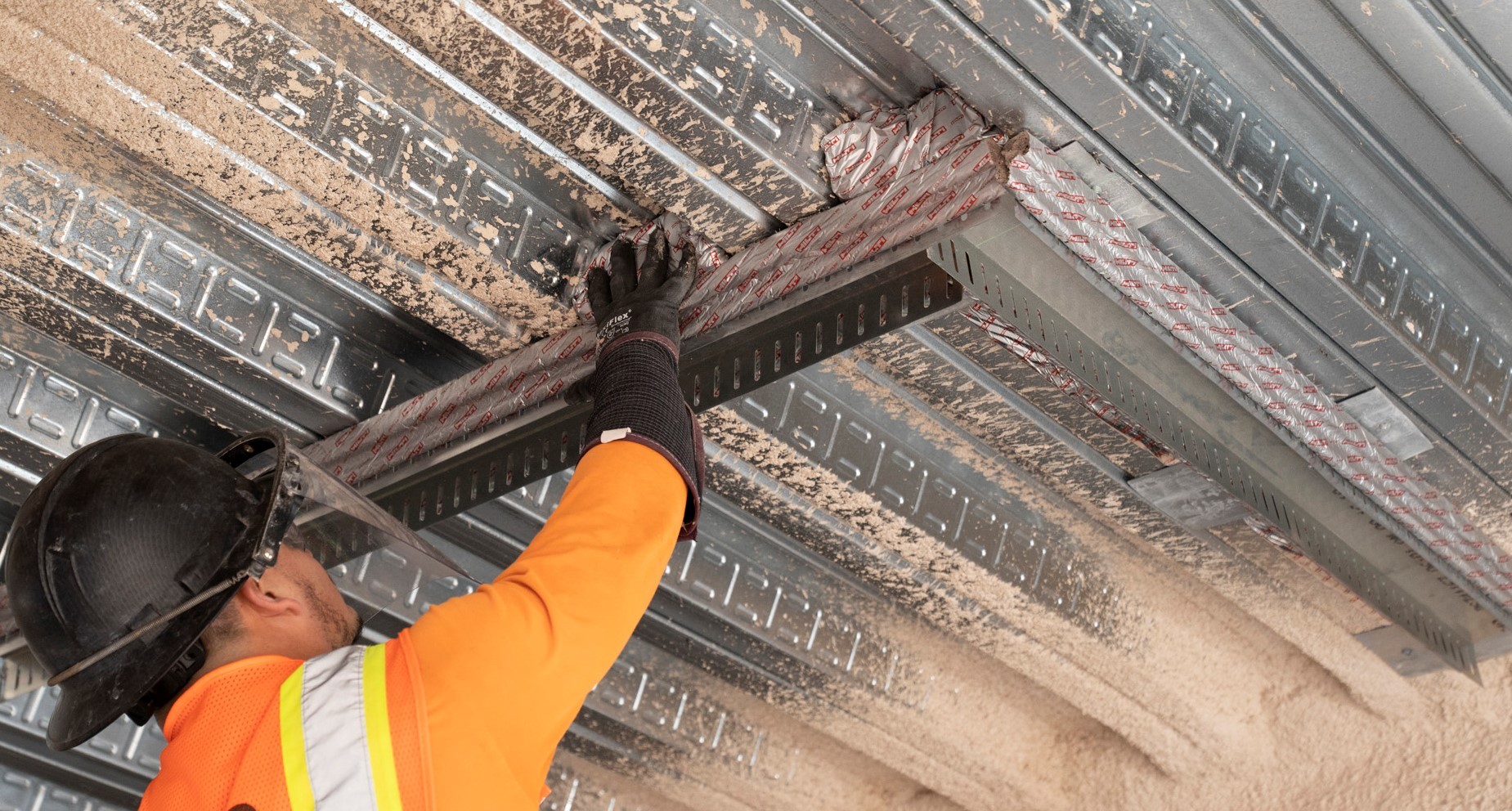 This worker is applying Hilti North America’s new CFS-TTS MD Top Track Seal, a preformed firestop solution designed specifically for metal deck construction. (Photo courtesy of Hilti North America)