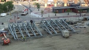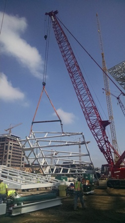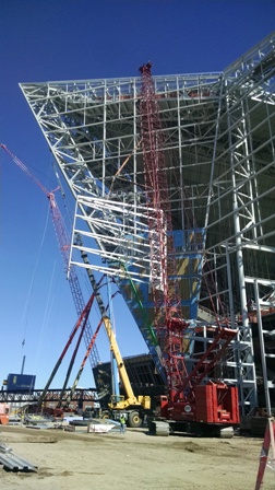 Erection of the doors was a monumental task, due to the size and the configuration of the door structures. “IDC was fortunate to be able to contract the door erection to Danny’s Construction Co., Shakopee, Minn., who set the main truss down the center of the stadium and the other long-span steel,” Doss says. “Danny’s had equipment on-site that was equal to the task and its engineers developed the special lifting apparatus necessary to lift and set the unusual shapes. Each door structure was assembled into two smaller sections on the ground. The lower section was then lifted into position and secured, before the upper section was positioned atop it and the sections welded together.”