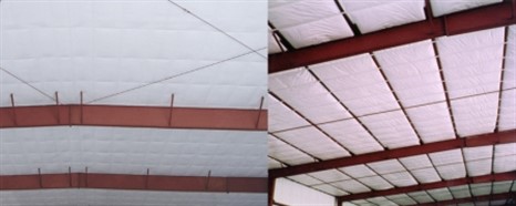 Using a single continuous piece of fabric in the liner system limits field sealing of the fabric to the perimeter of a bay. In a 100- by 25-foot bay with purlins spaced nominally 5-foot on-center, a liner system will require 250 feet of fabric to be sealed on-site. A long tab system requires two tabs to be handled for the entire length of each purlin in addition to the perimeter and any insulation butt joins. A long tab system in the same bay will require 1,050 feet of facing tabs to be handled in addition to the 250-foot perimeter, over 500 percent more than the liner system.