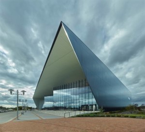 Exterior anodized aluminum panel rainscreen highlights convention center