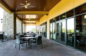 The Tuscany-style building is clad in stone and stucco, and a lower terrace at the building’s rear highlights the bar and grill. This is where metal ceiling panels were installed to add a pop of style. Hong Jin, RA, ASID, LEED AP, the director of sustainable design and interior design with Netta Architects, says the goal was to create timeless appeal with a variety of “beauty, healthy and purpose spaces.” The Linear Ceiling