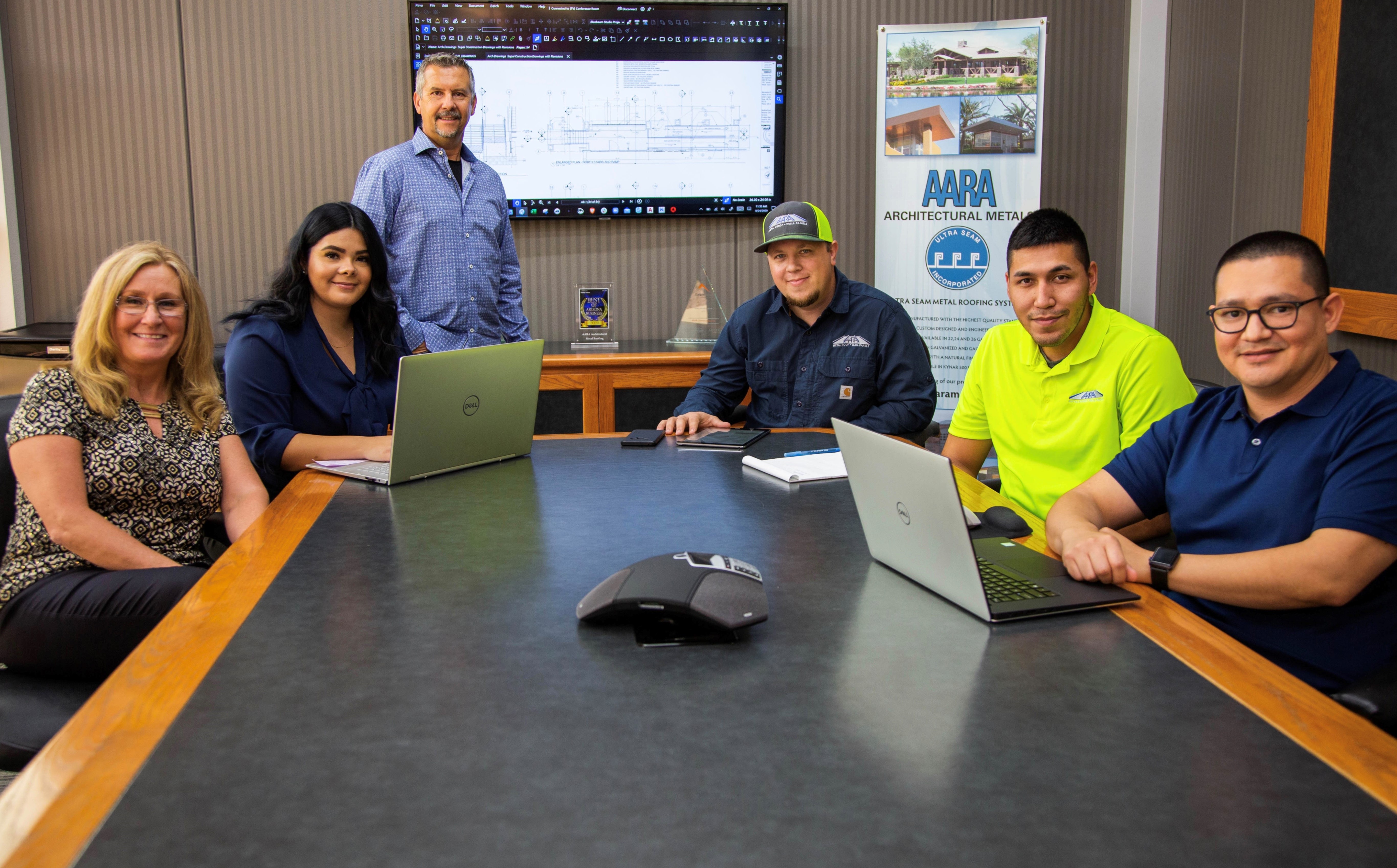 Kathy Stowe, controller, Angelica Merrill, project coordinator, Jerry Spores, president, Brad Wilembrecht, estimator, Jesus Andreas Ortiz, draftsman, and Ismael Fuyivara, engineering manager.