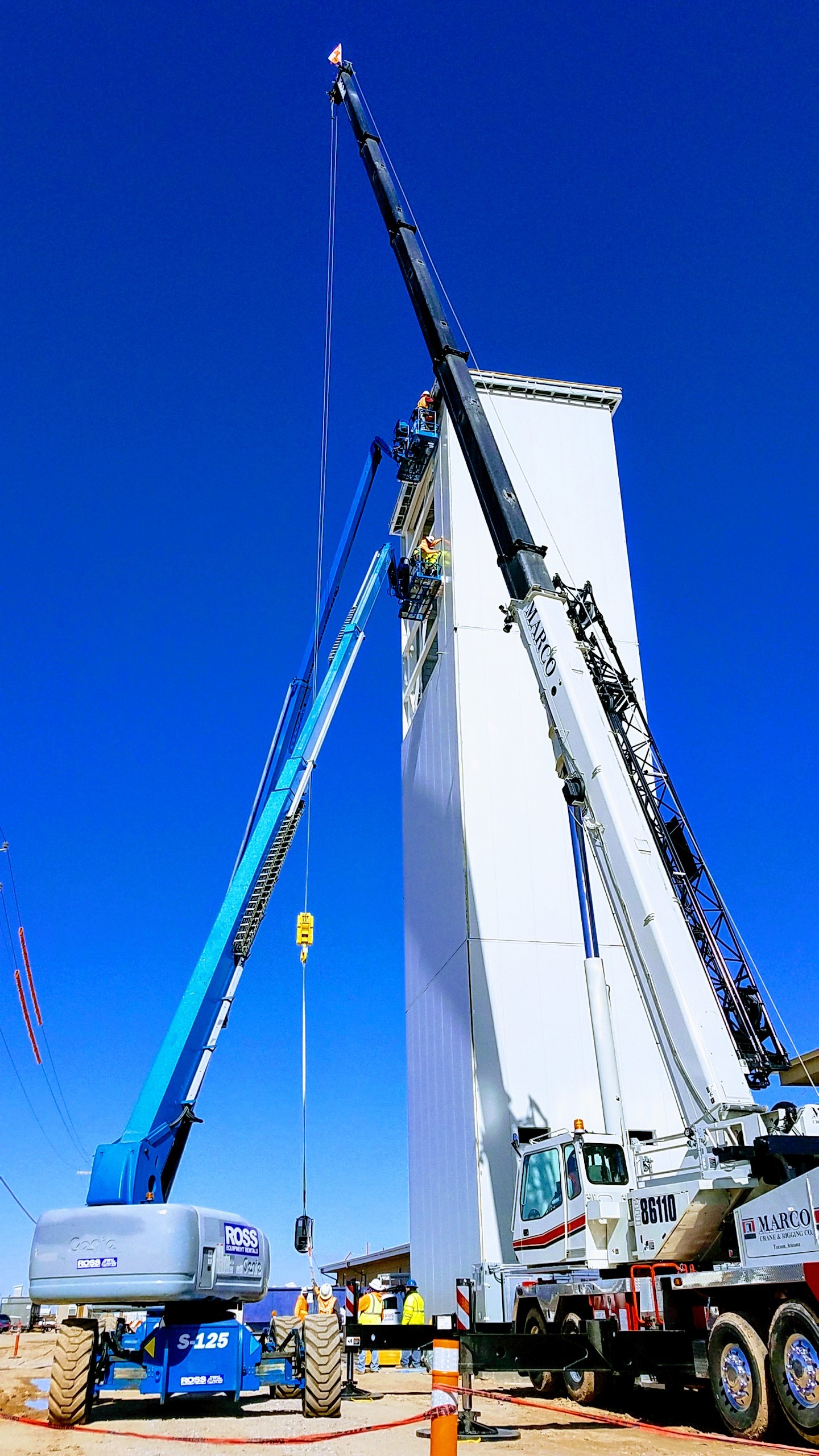 To install insulated wall panels on a 96-foot-tall parachute drying tower at Davis Monthan Air Force Base in Tucson, Ariz., AARA Construction employees used two lifts and a crane.