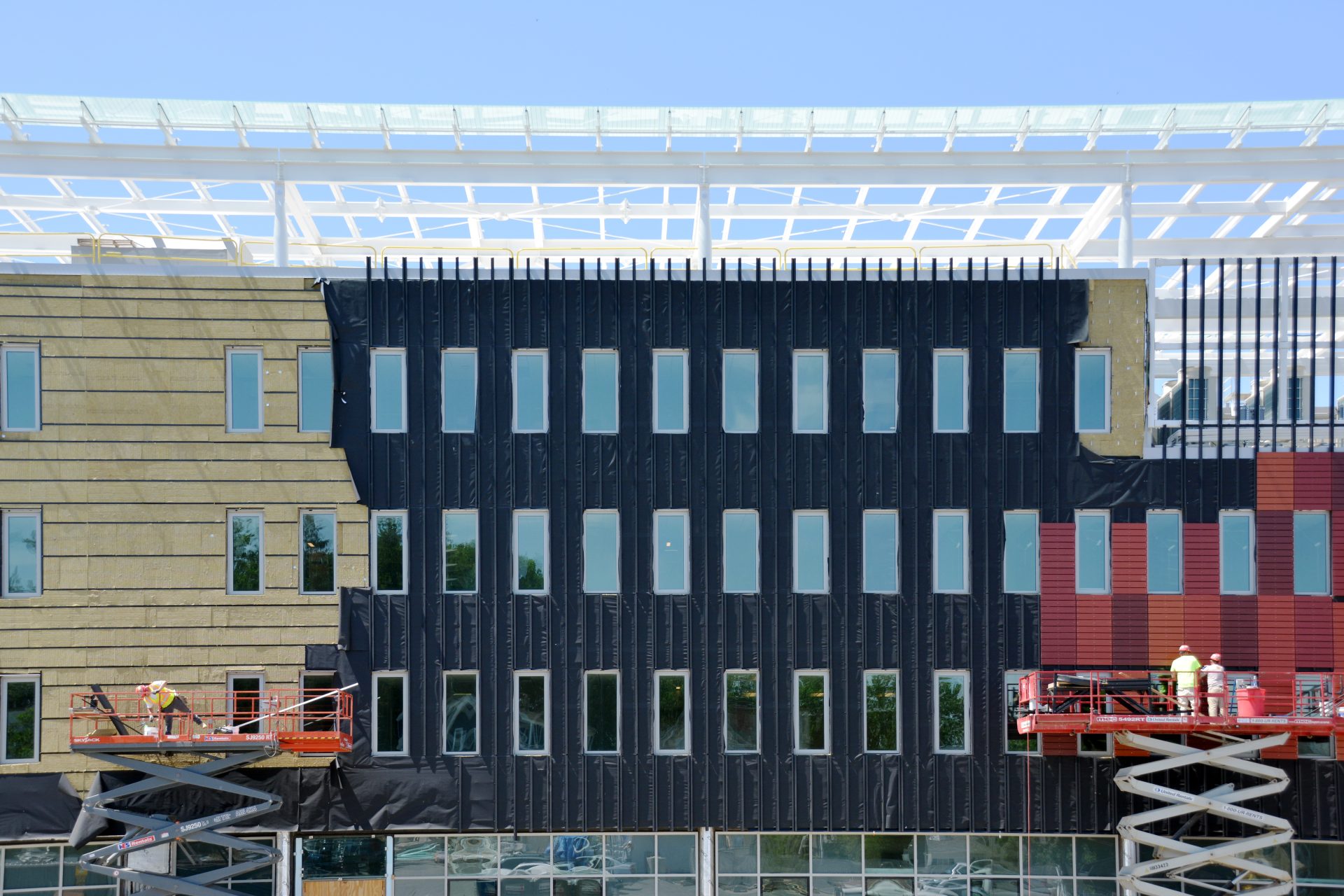 Typically, a UV-resistant WRB is located behind the cladding panel but in front (to the exterior) of the continuous insulation (c.i.). The function at this location is to prevent water from penetrating the building envelope while still allowing water vapor to escape. To that end, it must be highly moisture-vapor-permeable. In open-joint metal cladding systems where the cavity behind the cladding is ventilated, a WRB becomes even more critical because it acts as a primary line of defense, especially during heavy rain, strong winds, or storms when water can be driven behind the cladding.