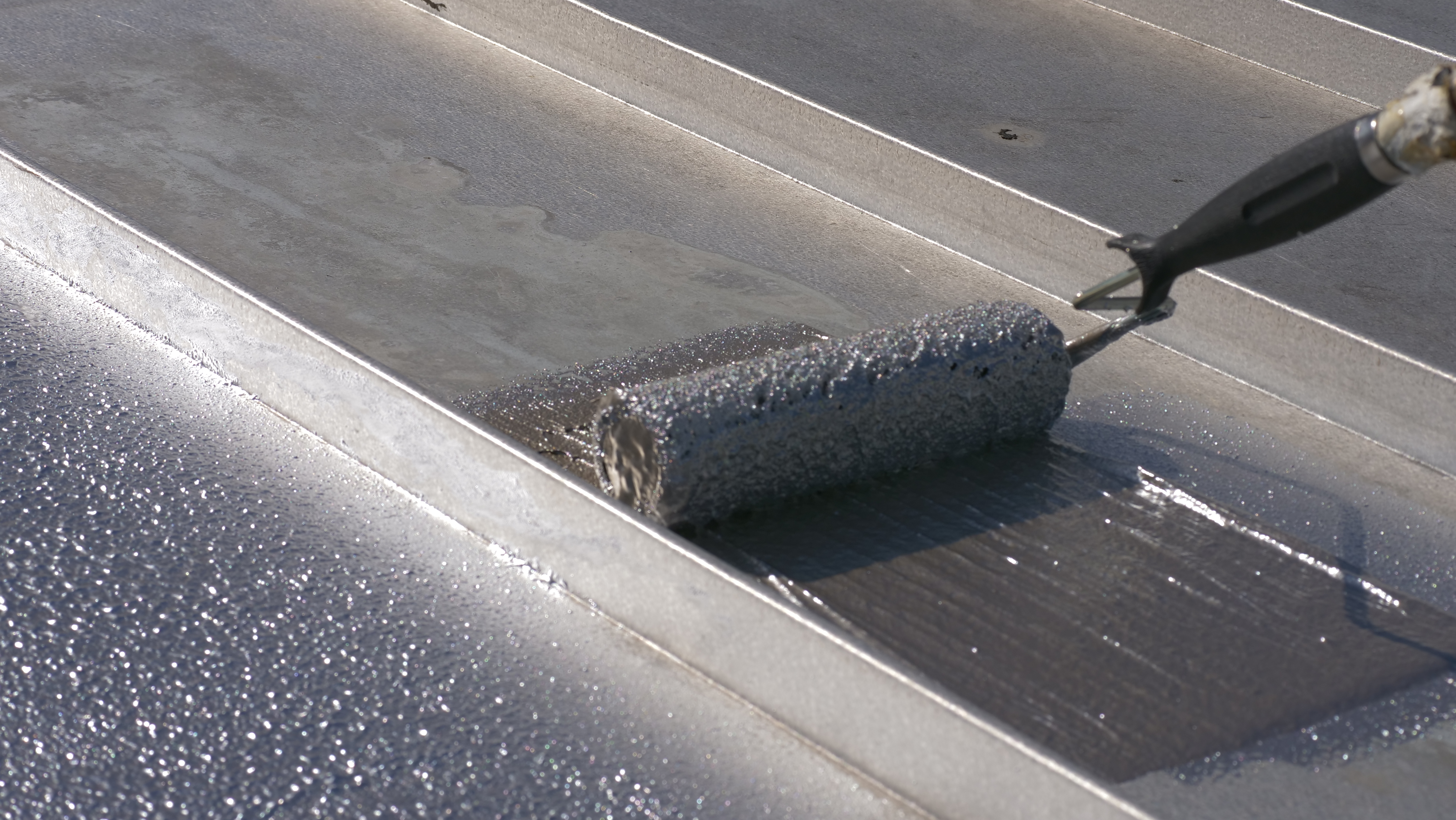 Mule-Hide’s 100% Silicone Roof Coating is being applied with a roller. (Photo courtesy of Mule-Hide Products Co. Inc.)