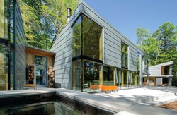 This private residence on Squam Lake in Holderness, N.H., was designed by Kane Architecture, East Hardwick, Vt., and it features 7,500 square feet of RHEINZINK America Inc.’s standing seam panels for roof and walls. Architectural metal occupies a small portion of the luxury home market and is most often found only on high-concept designs such as this. |
