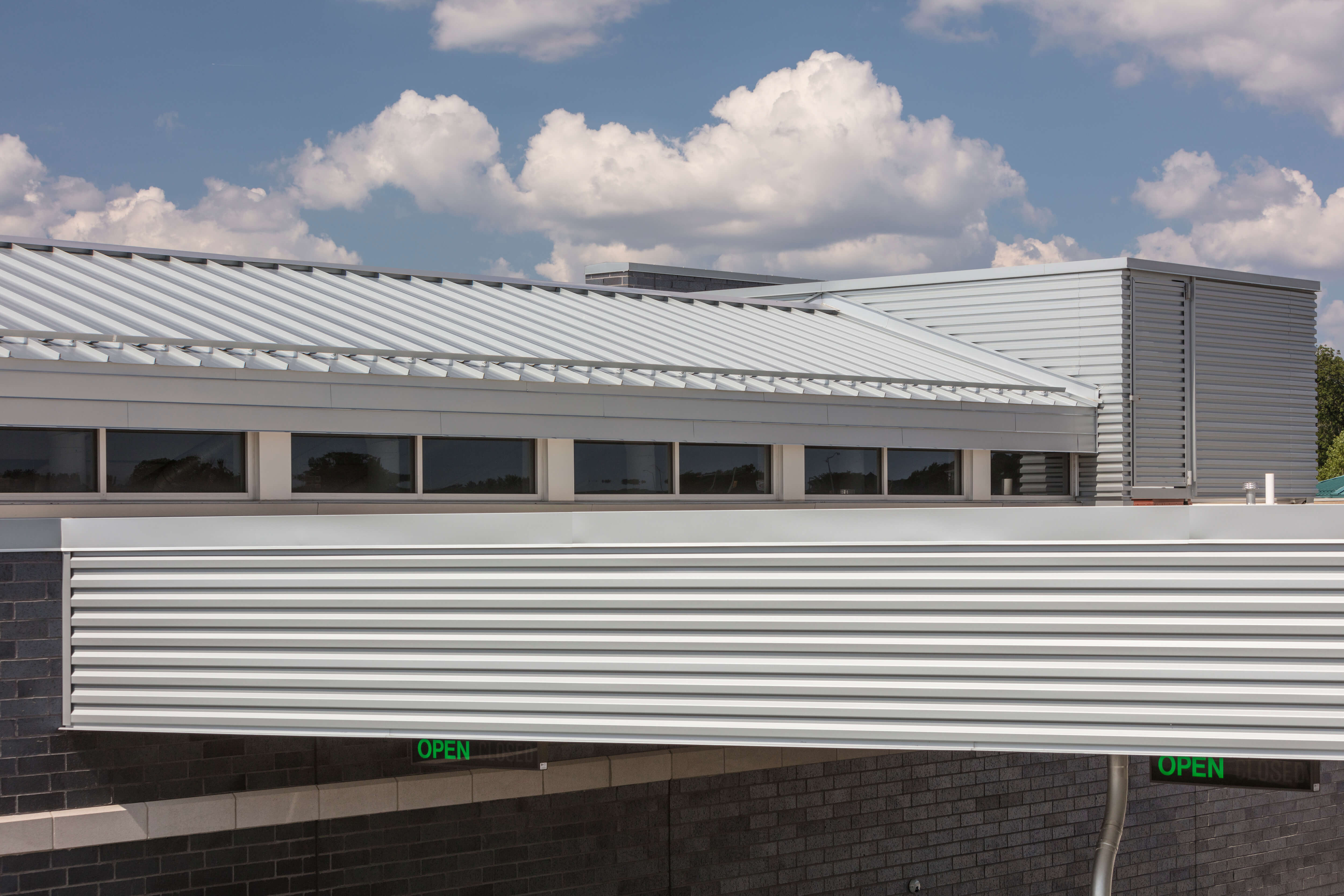 Metal applied to the Muskego branch includes Petersen’s Snap-Clad 24-gauge, 16-inch standing seam panels on the roof, HWP 16-inch ribbed wall panels on the interior and exterior walls, plus 12-inch Flush Panel in 22-gauge steel for soffits and interior accents. The exterior metal siding extends through a glass wall and wraps around portions of the credit union’s interior. All of Petersen’s PACCLAD metal is finished in Cool Silver Metallic. Fascia trim was fabricated from PAC-CLAD 24-gauge steel.