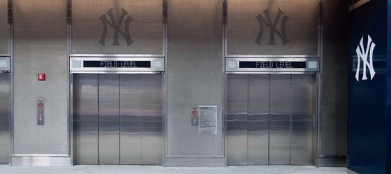 Throughout the Great Hall, you will find stainless-steel woven mesh from GKD-USA, Cambridge, Md. The walls around the elevator banks are clad with GKD’s Omega 1505 PC. Above the elevator doors, GKD used a media blasting process to etch the Yankees’ “NY” logo into its panels.