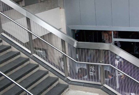 “We did a special weave on some panels,” said Leon Shockley, director of field operations for GKD. “We made the weave a little bit loose and that allowed us to hang it from the top structure, and we were able to rack it. The architect wanted the vertical cables to follow the angle of the stair structure and yet keep the horizontal rods in a perfect horizontal position.”