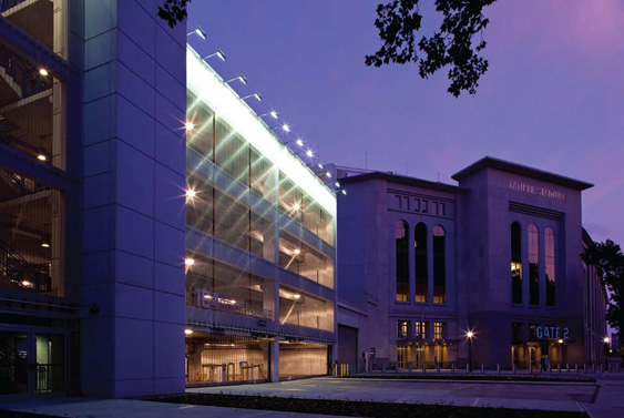 Construction and operation of the 164th Street Garage, which has 190 spaces and sits adjacent to the stadium, needed to be cost effective and efficient. A Cambridge Parkade architectural mesh system from Cambridge Architectural, Cambridge, Md., clad the building’s façade, and the chosen pattern managed to adequately cover the structure’s exterior while at the same time allowing enough airflow to negate the need for additional building systems— ultimately saving the project team money.