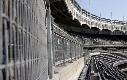 The style selected for Yankee Stadium—McNICHOLS’ open metal wire mesh in 0.192-inch (5-mm) wire diameter with a 3- by 1-inch (76- by 25-mm) rectangular opening and flattop/plain weave—worked well for high traffic areas that needed secure and unobstructed views. The carbon steel mesh was framed into panels of varying sizes and hot-dip galvanized for corrosion protection after fabrication. Besides providing protective partitions for seating sections, the wire mesh panels are used as borders for wheelchair areas located at intervals along the pedestrian walkways.