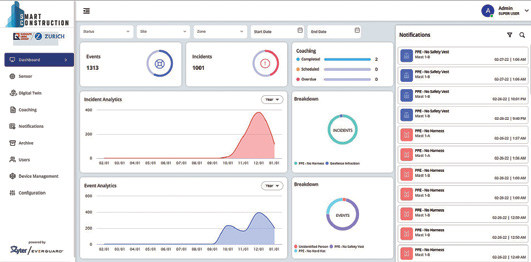 For this project, Zyter integrates its SmartSpaces Smart Construction IoT platform, analytics and front-end dashboard with Everguard’s Sentri360 AI platform, which is made possible through Qualcomm’s Smart Cities Accelerator Program and Qualcomm IoT Services Suite. Everguard provided environmental sensors, camera equipment and the computer vision technology, while NavVis provided point cloud scanning and 3-D photos, and Tag-n-Trac provided sensors for tracking equipment. Zurich monitors the impact and evaluates the solution for use with other construction customers.