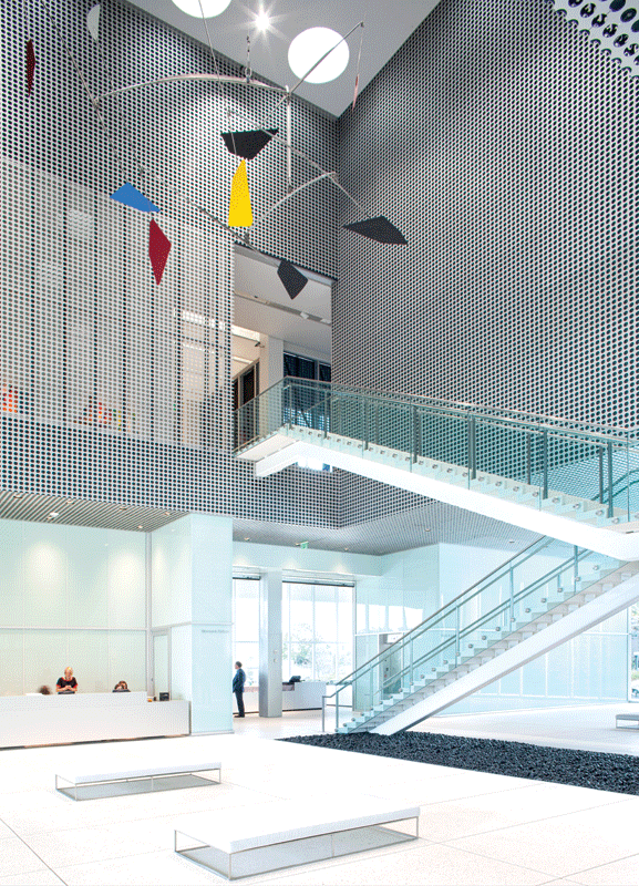 For projects with sustainable goals, perforated, finished metal products may offer additional advantages. Environmentally responsible liquid paint applicators can use a 100 percent air capture system and safely destroy the volatile organic compounds (VOCs) with a regenerative thermal oxidizer, so there is no adverse environmental impact. Anodized aluminum does not contain VOCs; it is an inert, noncombustible material and poses no health risks.