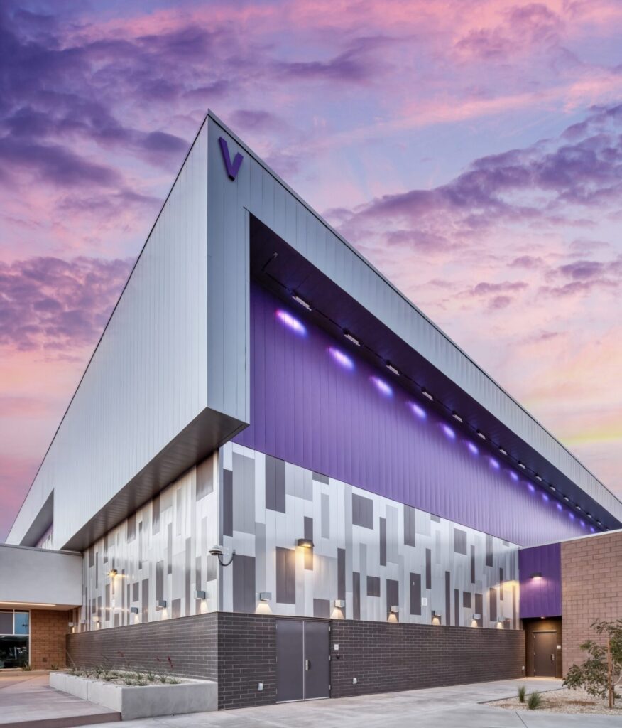 A band of abstract tiger stripes in monochromatic tones wraps around the bottom portion of walls on the exterior of Millennium High School’s Rise and Roar Center in Goodyear, Ariz. Above the abstract tiger stripes, signifying the school’s Tiger mascot, bright purple panels emphasize the building’s interior volume and display school colors. Furthermore, the pattern of metal panels break up the mass of the 4,180.64-m2 (45,000-sf) gymnasium and multiuse facility.