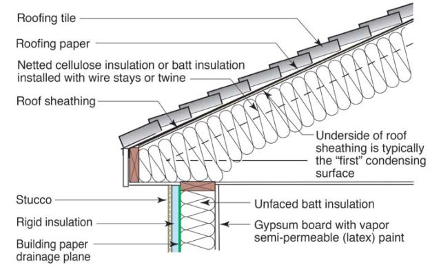 Unvented roof designs may be considered in two categories, Lstiburek says: systems where condensing surface temperatures are not controlled and systems where condensing surface temperatures are controlled. The two categories are used in different environments: regions where cold weather conditions occur with enough frequency and intensity that moisture accumulates from the interior on an un-insulated roof deck, which may cause mold, corrosion and decay, and warmer regions. “Your roof is an environmental separator,” Lstiburek says. “It keeps the outside out and the inside in. If the outside is really miserable it’s difficult to do; if the inside is miserable it’s difficult to do.”