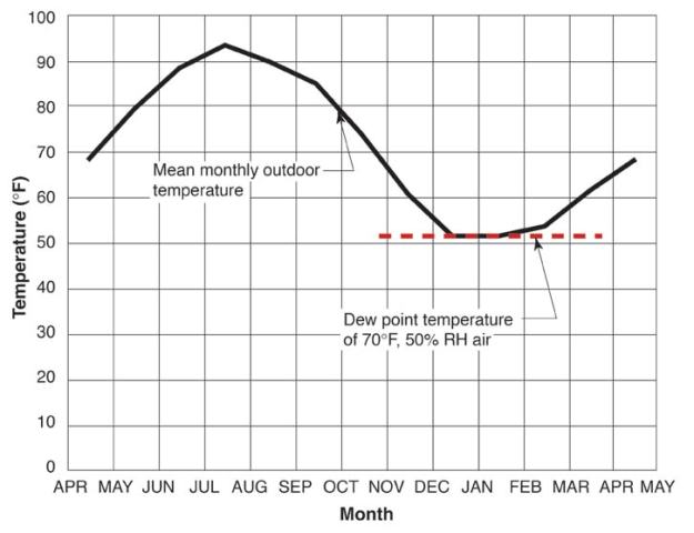 This diagram and graph display the potential for condensation in an unvented roof assembly in Phoenix in which condensing surface temperature (underside of roof sheathing) is not controlled. There is no potential for condensation on the underside of the roof sheathing until interior moisture levels exceed 50 percent relative humidity at 70 degrees F.