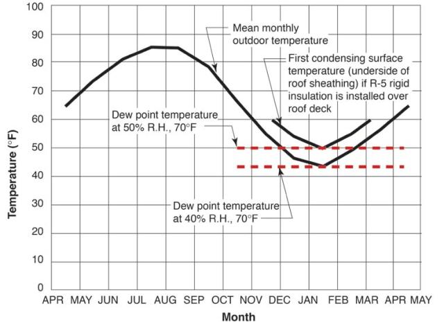 This diagram and graph display the potential for condensation in an unvented roof with insulating sheathing and rigid insulation above the roof deck in Dallas. There is no potential for condensation on the underside of the roof sheathing until interior moisture levels exceed 40 percent relative humidity at 70 degrees F when rigid insulation is not present. Rigid insulation raises the condensation potential above 50 percent relative humidity at 70 degrees F.