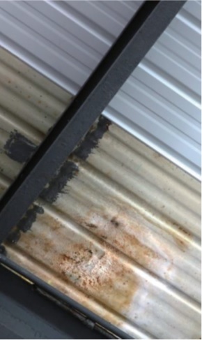 This chemical plant interior roof shows PVF film (on the top section) at six years old, and PVDF coating (on the bottom section) at less than two years old.