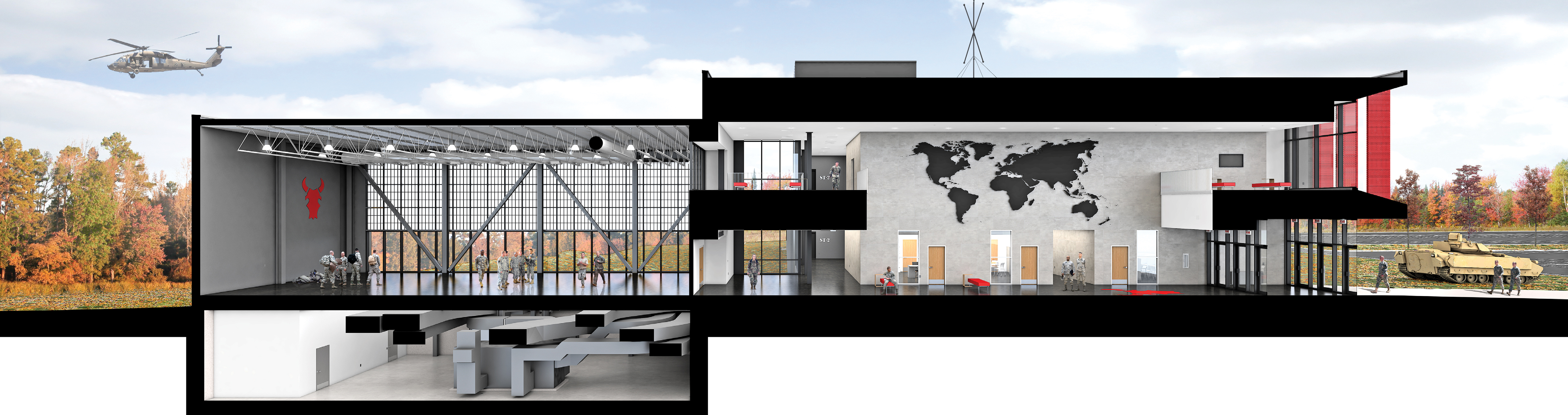 The facility is organized around a central hub and divided into three functional masses to accommodate the operational specifics of National Guard training. This led us to a design that is organized into three functional masses.